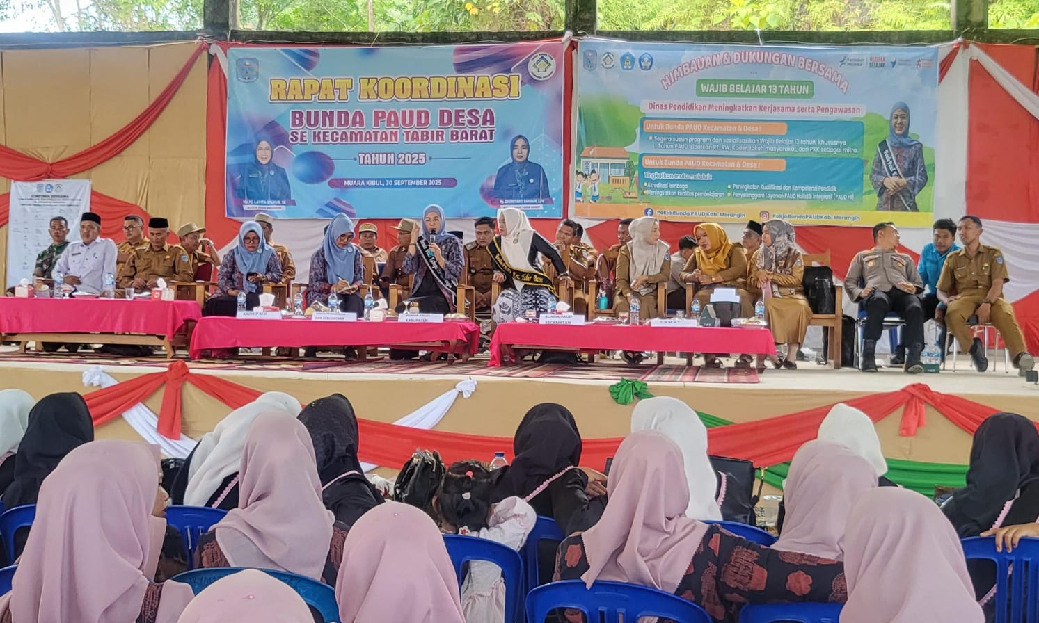 Hadir Forkompicam Tabir Barat, Kabid PAUD Dikbud Merangin Rika Elyuma, Camat Tabir Barat Abdul Rahman bersama Bunda PAUD Tabir Barat, Kabid Pemberdayaan Kelembagaan Dinas PMD Eilia Studyawati, Kades se-Tabir Barat dan Bunda PAUD Desa se-Tabir Barat.