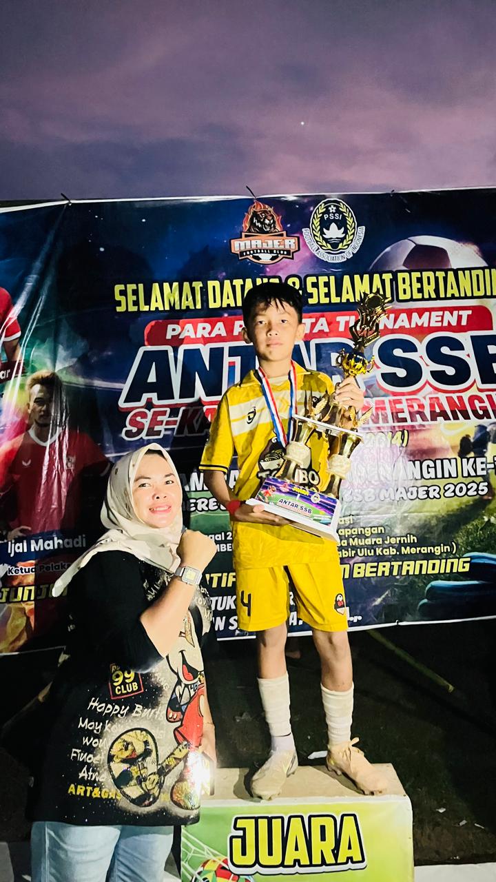Merangin – Prestasi membanggakan kembali ditorehkan oleh salah satu talenta muda asal Kabupaten Merangin. Abiza Alfaiz Wirawan, putra dari Ernova Dewita, sukses meraih prestasi gemilang dalam ajang Turnamen Sepak Bola Antar Klub SSB se-Merangin yang digelar di Desa Muara Jernih, Kecamatan Tabir Ulu, beberapa waktu lalu. Turnamen ini dalam rangka memperingati hari Jadi Kabupaten Merangin Ke-76 tahun dan juga sebagai ajang pembinaan atlet usia dini.